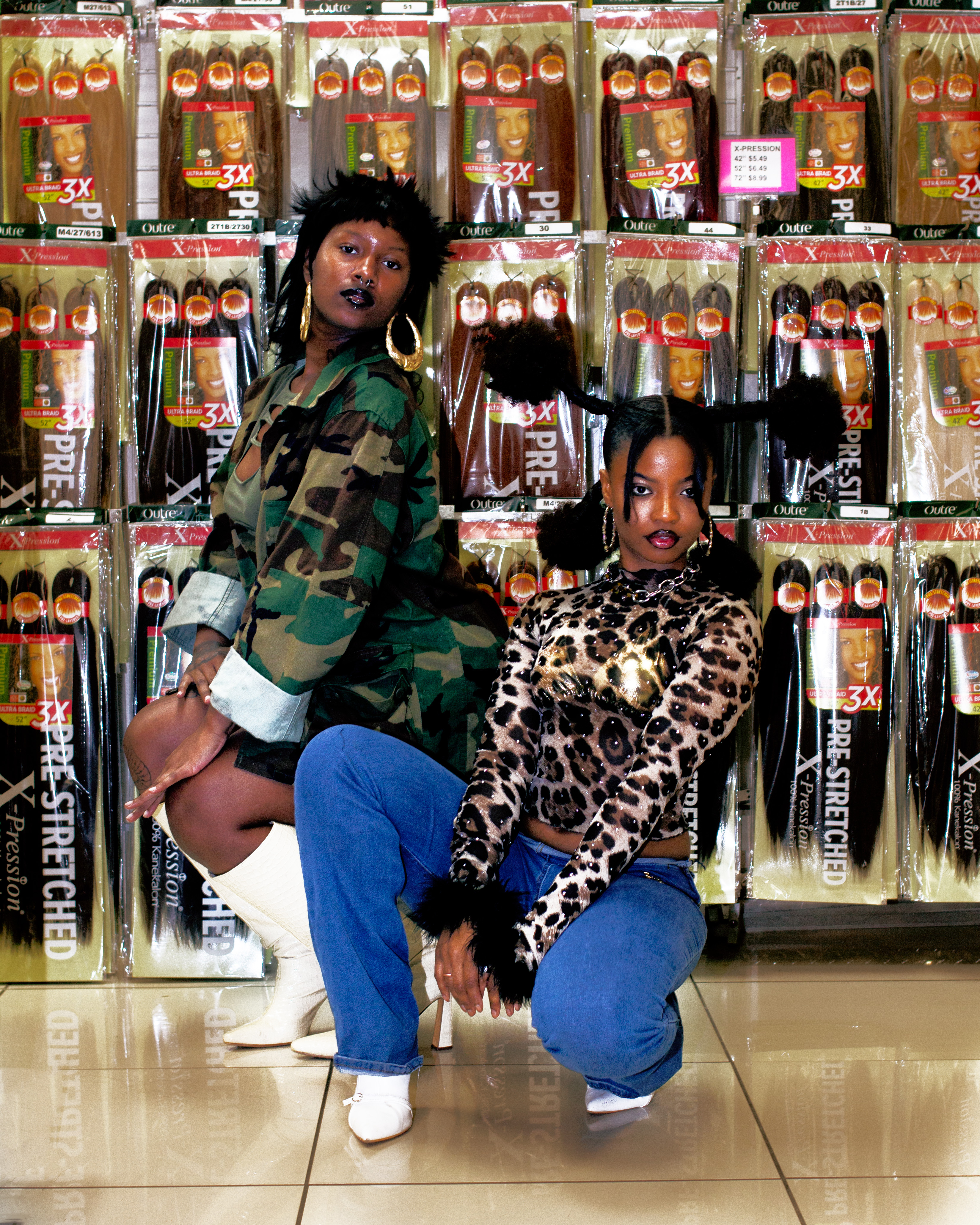 Hope: It's crazy because I literally came up with the concept while she was out there, and I really didn’t want to bother her, so I'm like, 'You know, let me just wait till she comes back, let her enjoy her time. But I had seen her post a picture of her hair; she had these blue beads... I just feel like your hair is different, bro. I was like, ‘Yo, that's crazy’ because, the concept that I had come up with was like, I'm gonna do it literally like her hairstyle. Yeah, so what I'm gonna do is like, I really want to take it back to being a child, like that nostalgia. You know, so this is like highlighting black hair, especially in the 90s hair exhibitions. It's extravagant, you know, but it's like, where do we all get inspired from to even get into like that mindset of oh, black hair is this. It has to start somewhere and it started as a little child.