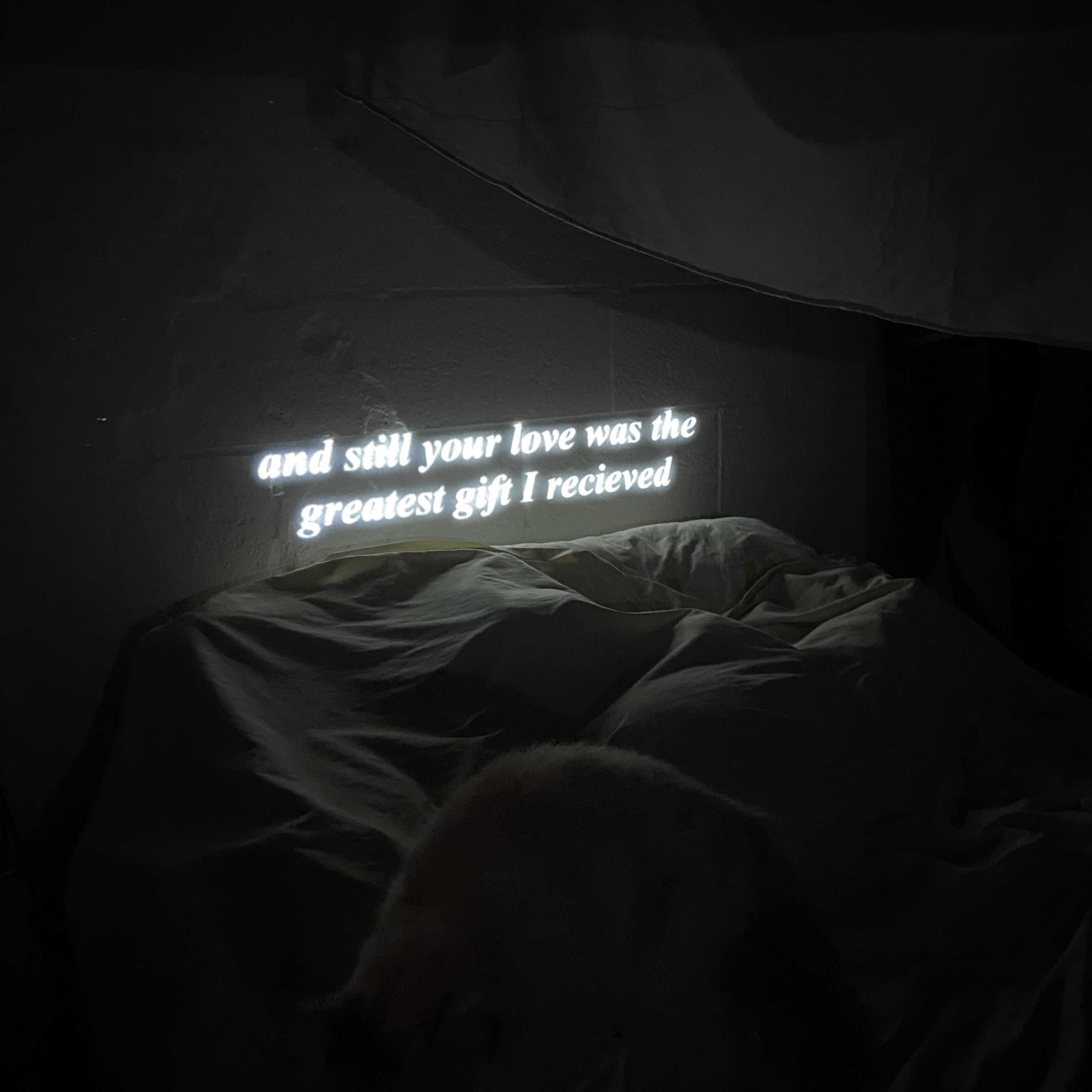 EE: I just feel like I might not be able to get enough off with just using one medium. Just like I said, pictures vs words, I feel like I'm incredibly lacking when I’m only using one medium. So like with the projecting the words, like the sweater said “I have loved far beyond what the physical body knows.” So I write a lot of poetry obviously, that's one medium that I don't particularly like to share because it is very dramatic and grotesque. But I feel like in having the Instagram handle @ifeelloveandifeelpain, I think emotions are important to talk about, for me especially love and pain is such a difficult concept for me to grasp. Like I grew up in Mesa and then I moved to Gilbert and had a pretty normal life, like pretty privileged it was pretty great, but I also experienced a lot of abuse from my father and my brothers. So I have this very intense internal struggle of what love is, and what constitutes love and what constitutes pain, and why that is. And that’s a very personal journey that I try to put into my art a lot. And that phrase, “ I have loved you far beyond what the physical body knows,” I just didn't know any kind of way I could put that into a different medium and have it translated the same way unless it was in your face. And I had already done this kind of string of stuff in the background, and that’s because I was trying to kind of emulate what Tyler Mitchell had done with the hanging stuff. And I think having it hung up and the way that it looked and the way that it faded out and having it just like blast across the chest and the arms wide open.