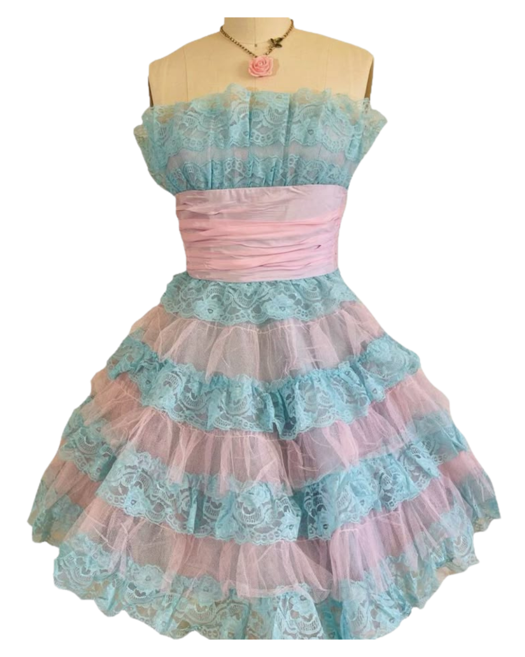 BETSEY JOHNSON TEA PARTY DRESSA whimsical yet beautiful frilly dress made with a delicate combination of blue and pink. I’m in the midst of growing my personal style which at the moment is crazy and colorful and this dress would be a staple if I had it. I’d wear it out in places it doesn’t belong.