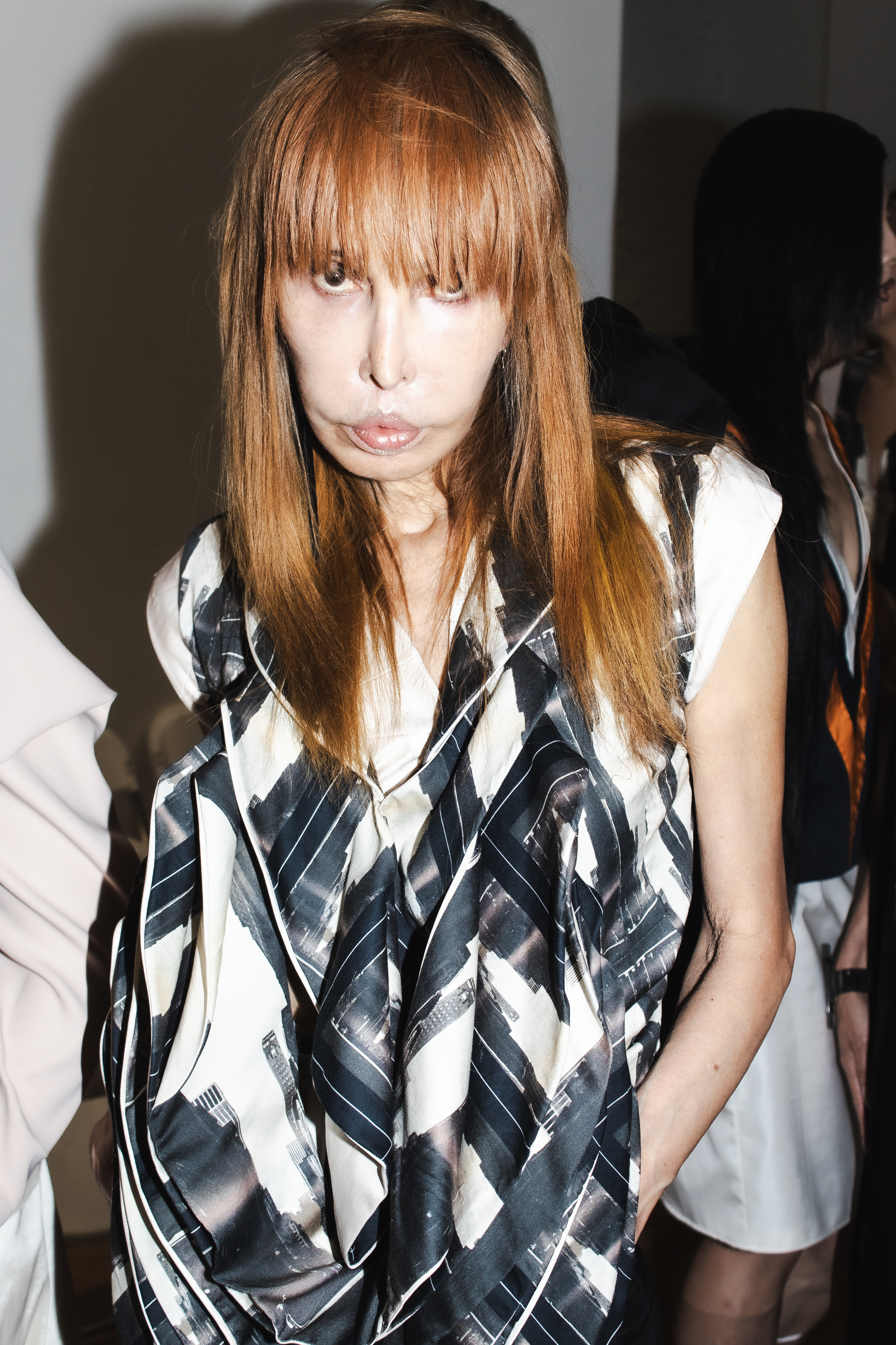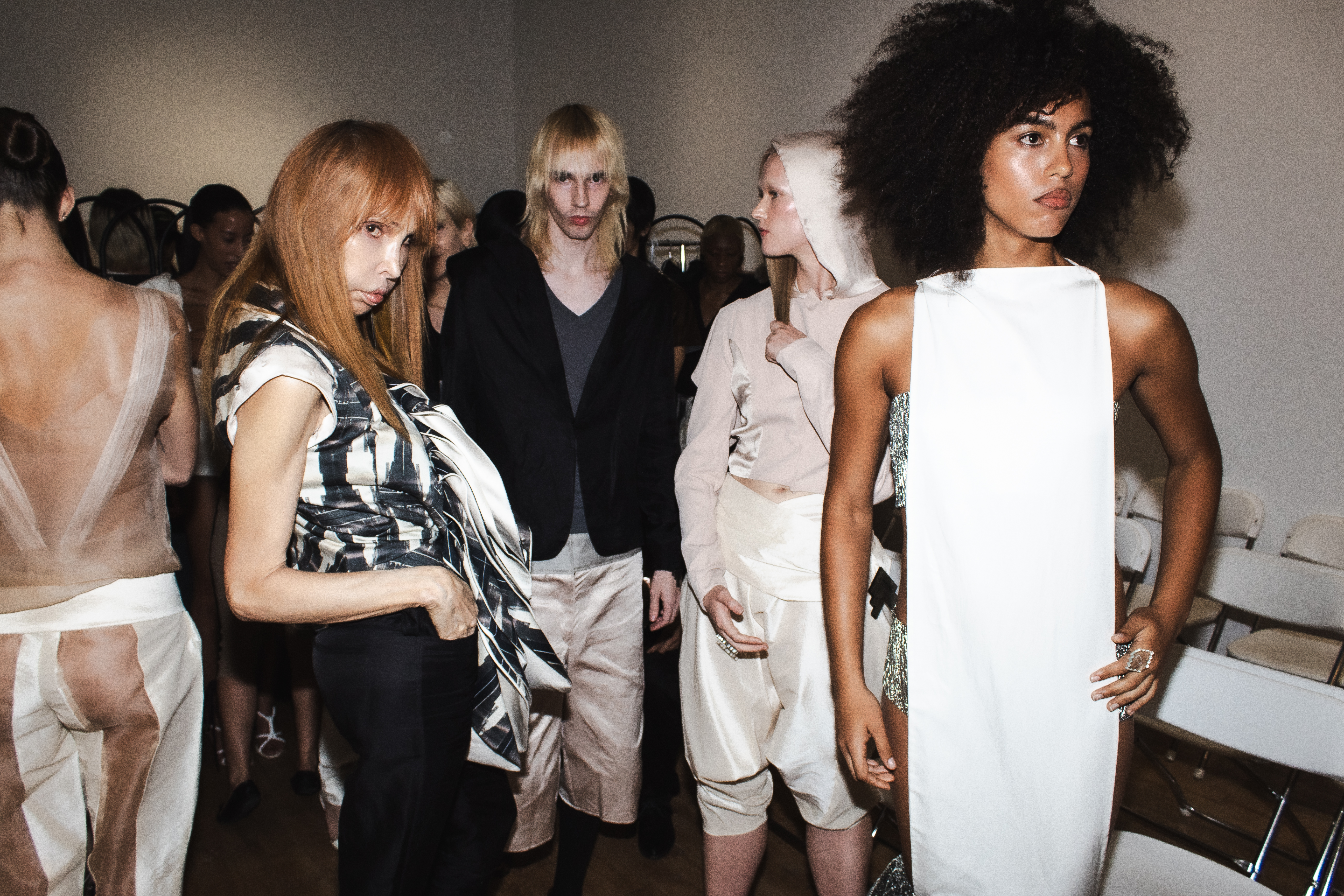 Taking notes from the machine-made craze of the art deco movement, the laser cut acrylic fabrications were developed by core members of Iseder’s team, which is the kind that feels like a blended family or a feverish Venn Diagram. There’s the stylist who also leads casting. The convergence of four musicians who played together for the first time5. The appearance of The Saw Lady, who busks at the subway, the runway cameo of NYC royalty Sophia Lamar. Everyone wears three to five hats. Some of them live together. It is the quintessential element of New York, intersections and cross-sections and hyphenation, biomes that begin and end with The People Who Make It What It Is.